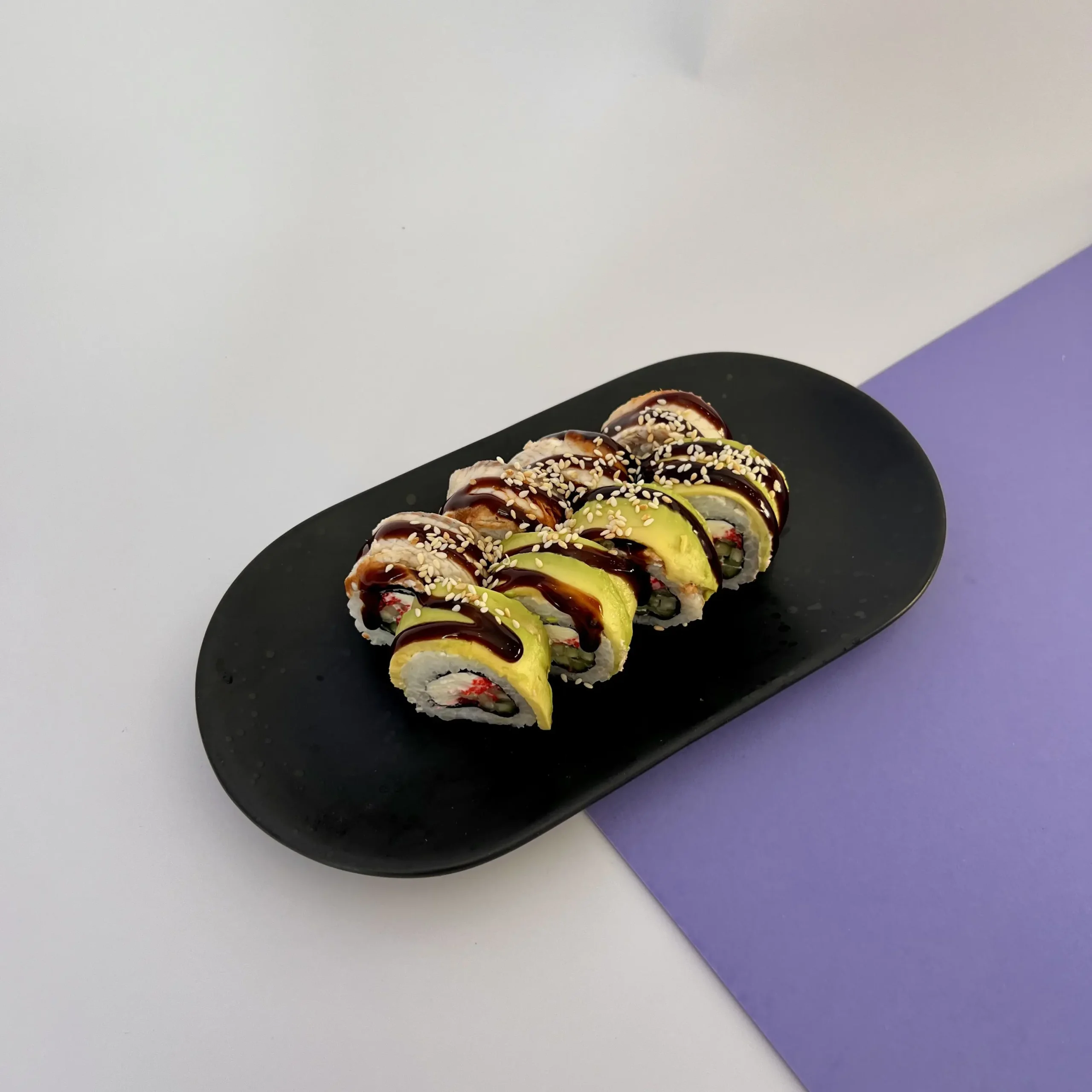 Рис, норі, сир Філадельфія, масаго червона, огірок, авокадо, вугор, соус унагі, кунжут білий.