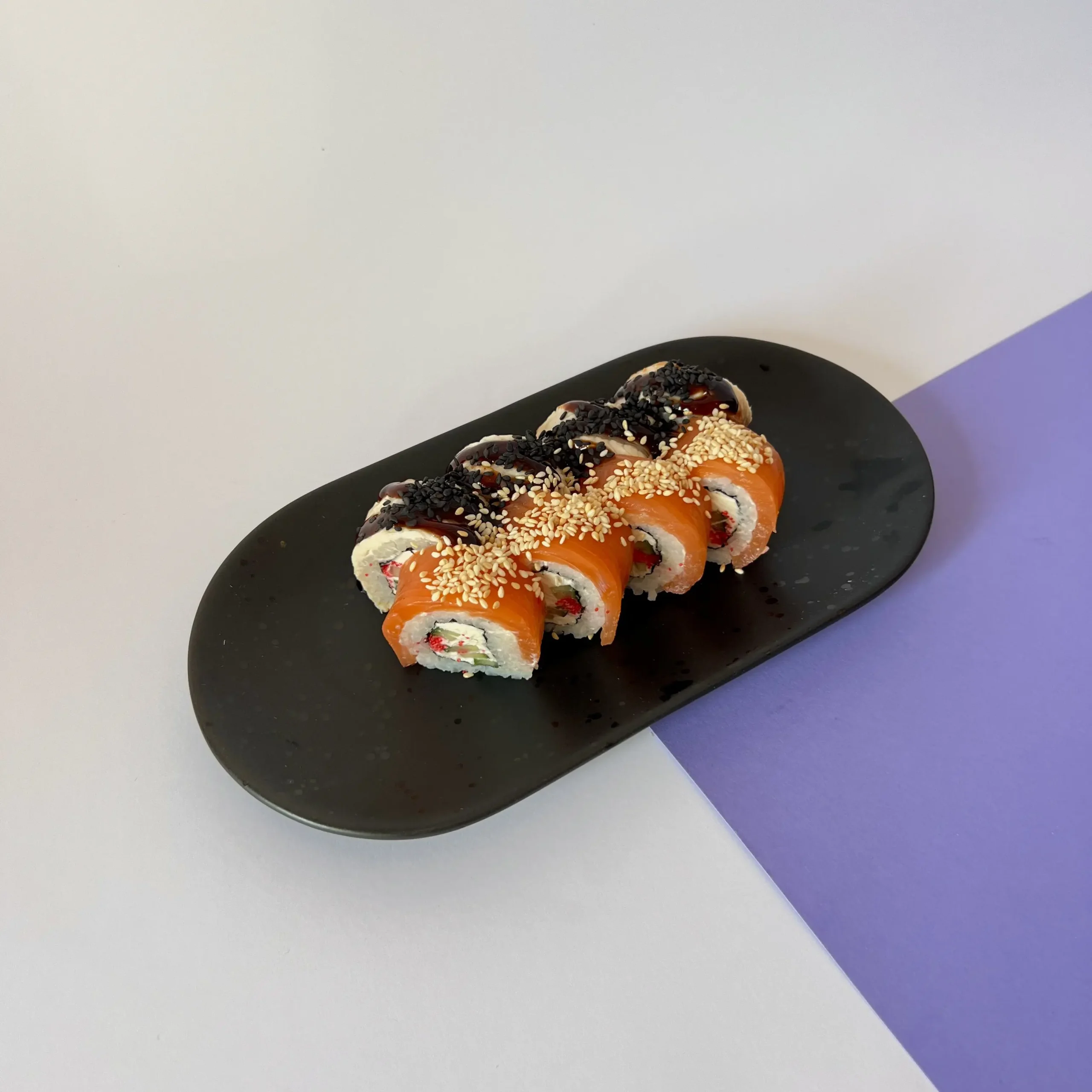 Рис, норі, сир Філадельфія, огірок, масаго червона, лосось, вугор, соус унагі, кунжут чорний, кунжут білий.