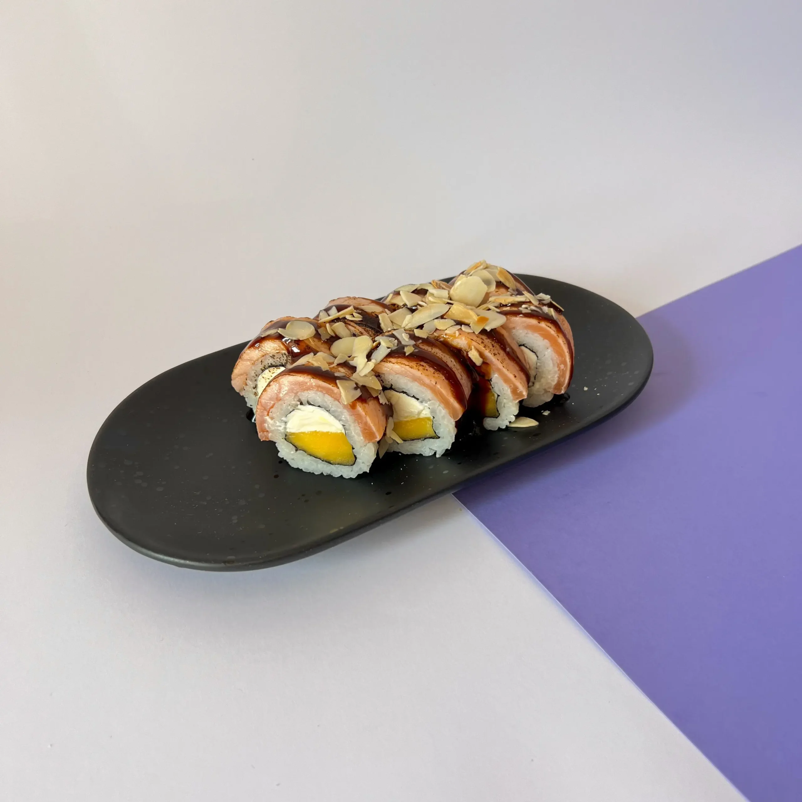 Рис, норі, сир Філадельфія, манго, лосось (обпалений), соус унагі, мигдалеві пластівці.