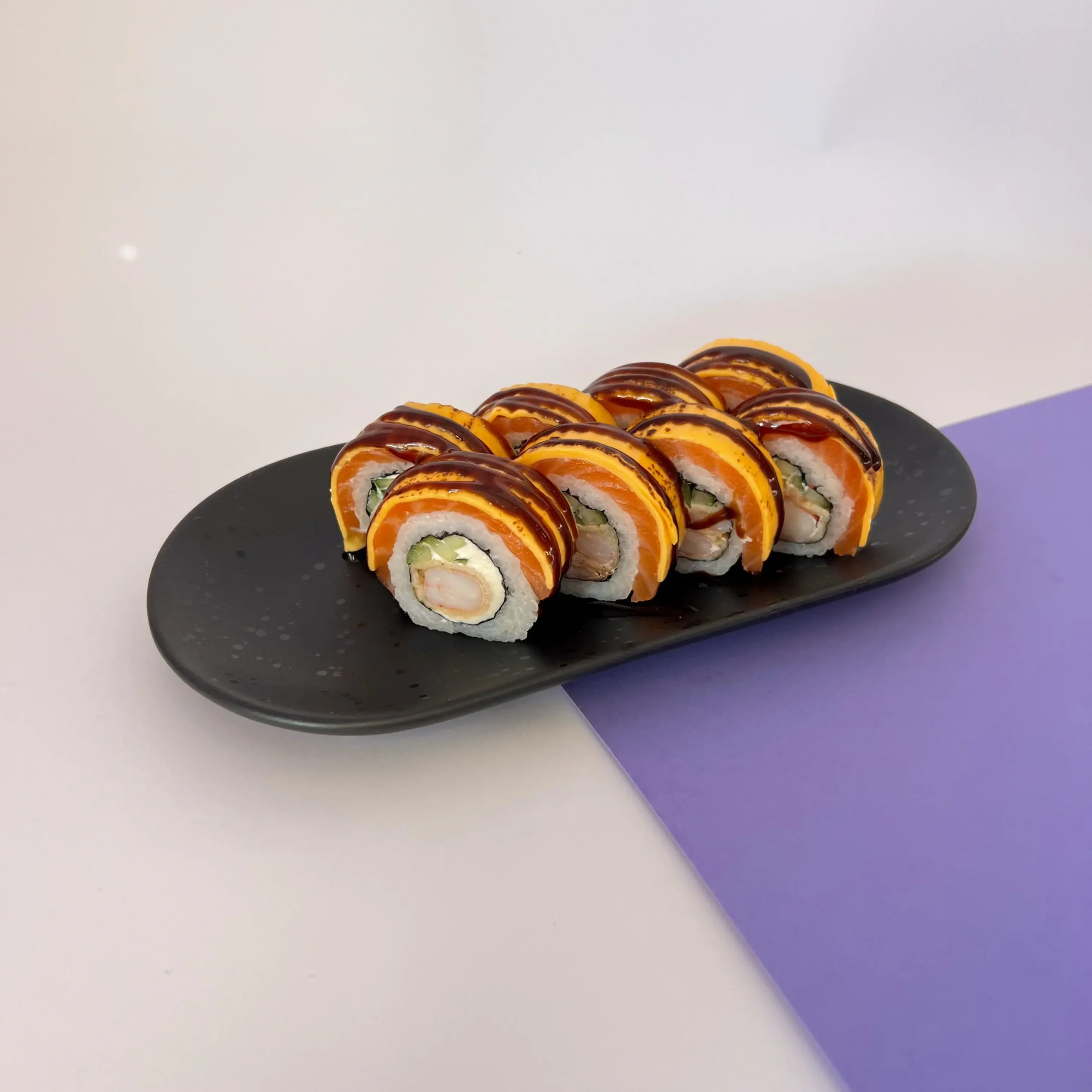 Рис, норі, сир Філадельфія, креветка темпура, огірок, лосось, сир чеддер, унагі соус.