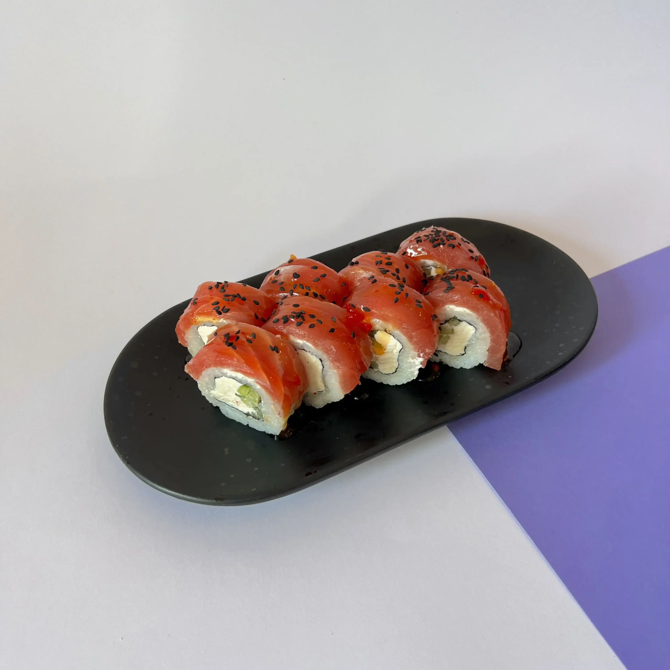 Рис, норі, сир Філадельфія, огірок, тунець, соус солодкий чілі, кунжут чорний.