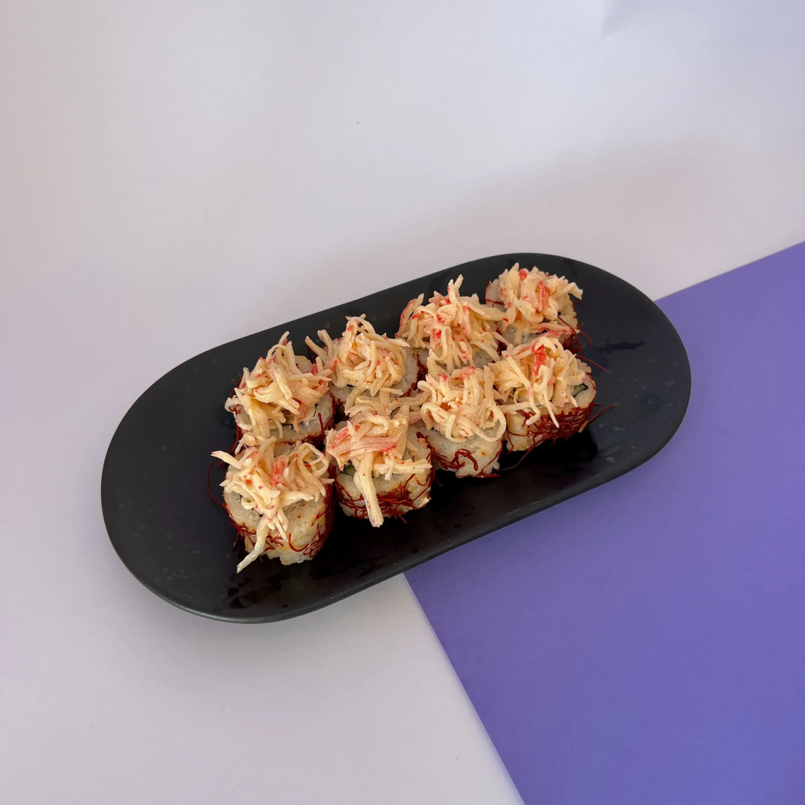 Рис, норі, сир Філадельфія, огірок, лосось запечений, нитки чілі, крабовий мікс.