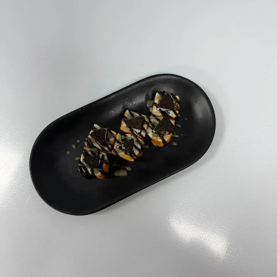 Соєвий папір, ківі, сир Філадельфія, білий шоколадний топінг, орео, топінг чорний шоколад.