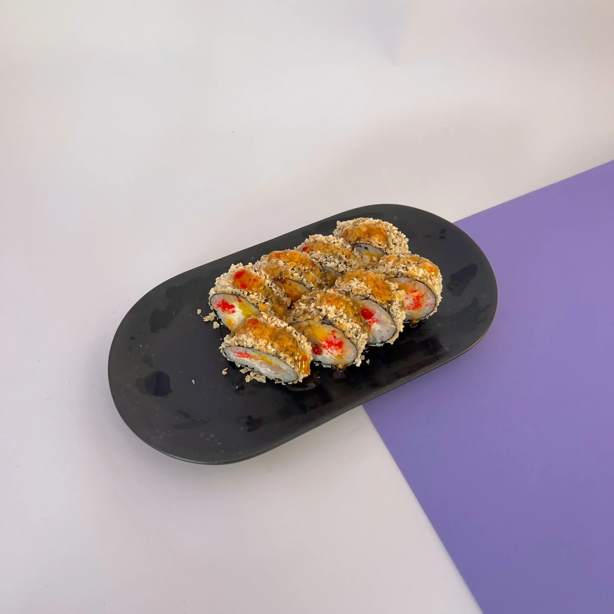 Рис, норі, сир Філадельфія, тунець, манго, масаго червона, паніровка панко, соус чілі.
